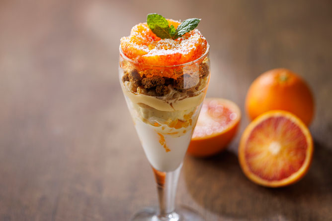 柑橘“タロッコオレンジ(ブラッドオレンジ)”を使い、甘味、辛味、酸味、苦味のバランスの取れたパフェ。