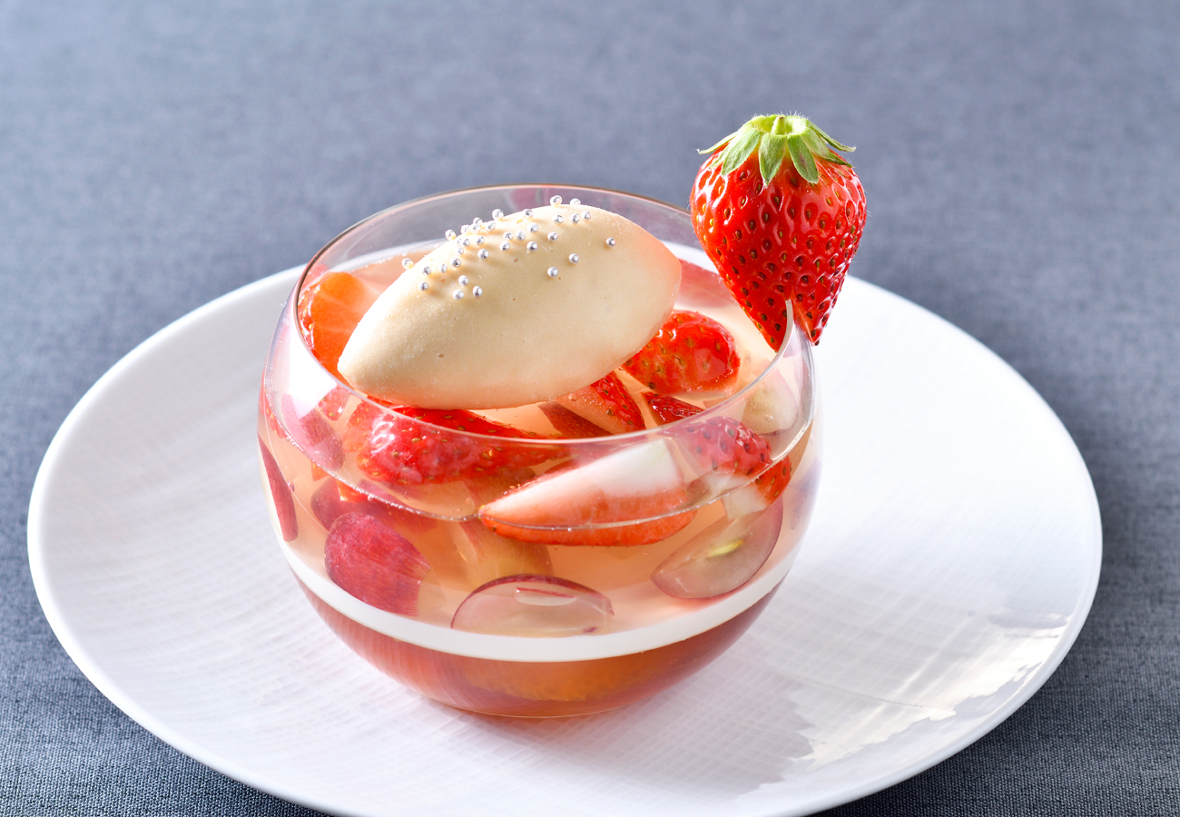 キャラメルアイスをトップに、果実の風味を閉じ込めたレモンジュレ、なめらかなパンナコッタ、香り豊かなアールグレイのジュレが層を織りなします。