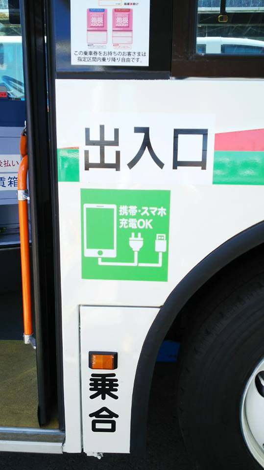 車両の前面と側面に携帯・スマホ充電OKのステッカーがついているので、見つけたらぜひ乗ってみて下さいね♪