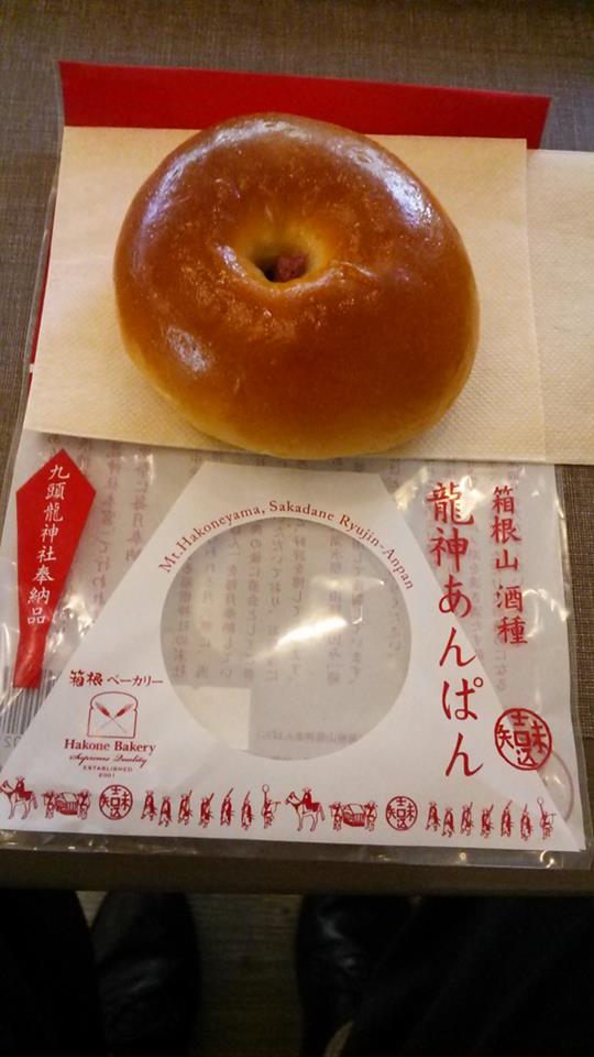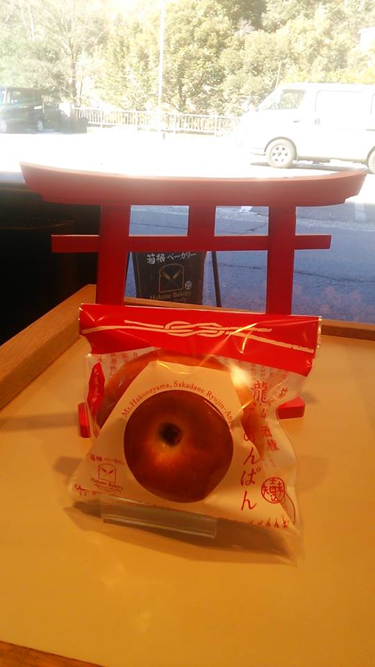 ”箱根山龍神あんぱん”は、「箱根神社の龍神水」を使用し、「九頭龍神社本宮」で行われる月次際に毎月奉納されているパンです。私にとっては、サイズとしては、大きくもなく小さくもなく、餡のつぶ餡も、あますぎずということで、とても食べやすく感じました。観光などをしていて小腹がすいた時には、ちょうどよいおやつになるのではとも感じました。また、店内には、インスタ掲載用に箱根神社の鳥居との組み合わせで、掲載写真のような撮影スポットもありました。