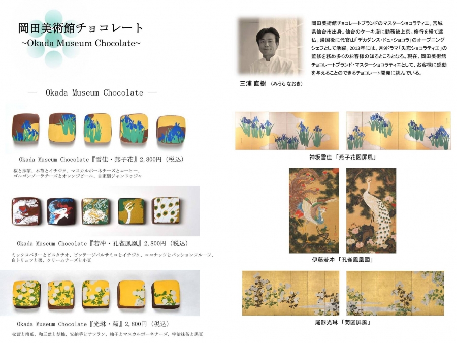 チョコレートは岡田美術館専属のショコラティエ・三浦直樹さん(月9ドラマ「失恋ショコラティエ」で監修を務めた方です!)がひとつひとつ手づくりしており、美術館をモチーフにしたボンボンショコラは美術館ならではの商品となっています!