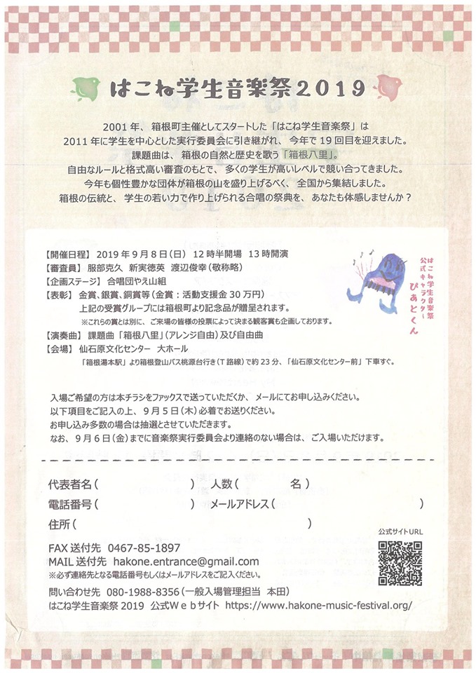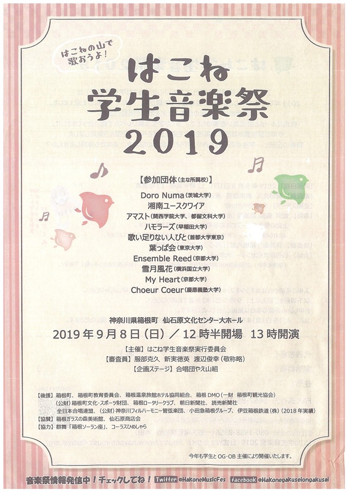 今日は、国際観光地・箱根町を舞台に、歌を愛する学生が、友情と人々との交流を育みながら、自由に表現できる新しい形の合唱コンクール・・・「はこね学生音楽祭2019」のご紹介です!