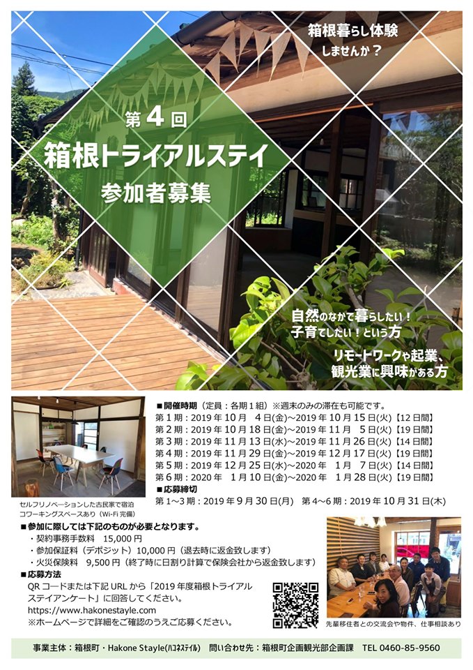 今回は新たにトライアルステイやコワーキングスペース用としてリノベーションした空き家を使用するほか、地元の移住者支援団体”HakoneStayle(ハコネステイル)”が移住者であり地元民ならではの「おもてなし」で皆様の移住体験をサポートします!