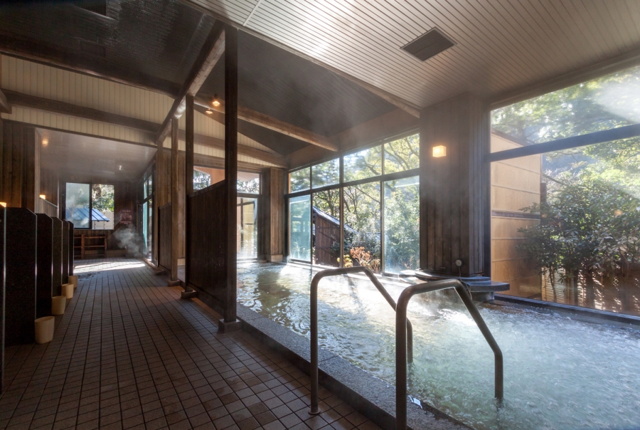 大浴場の内湯では、男性用・女性用ともに古材で組まれた太い梁や壁に貼られた墨色の杉板、大きなガラス窓に映る山の景色が落ち着いた雰囲気を醸し出しています。