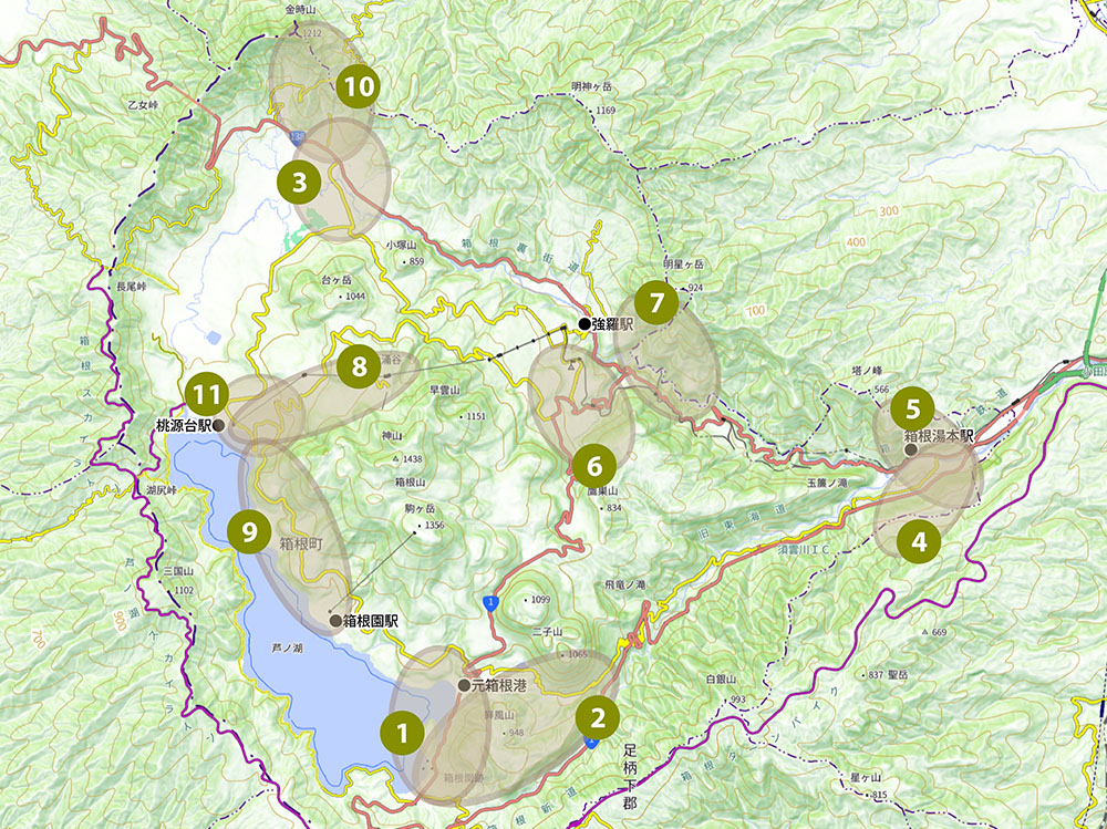 | コース | 桃源台駅~ビジターセンター~金太郎岩展望台~舟見岩~姥子駅(大涌谷駅) ※約2時間30分 |