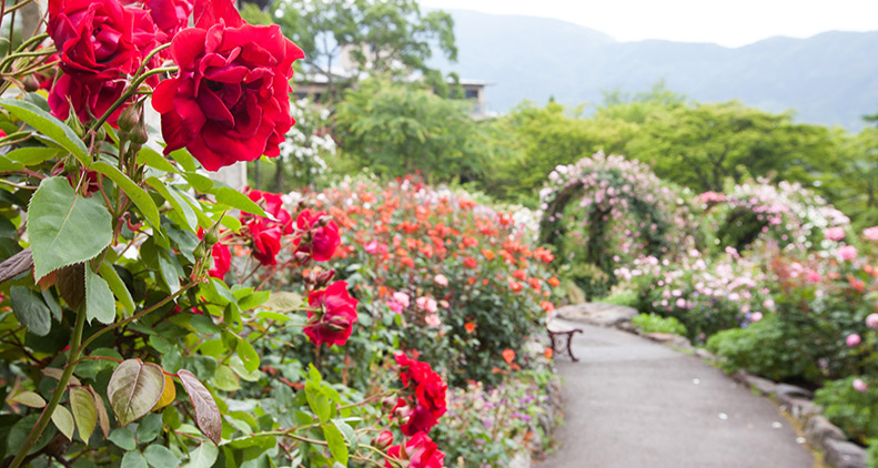 桜、ツツジ、アジサイと四季折々の花が楽しめる園内の中でも、その鮮やかさでひときわ目をひくのがローズガーデンのバラ。約140品種、1,000株のバラが植えられ、春の新緑、秋の紅葉とのコラボレーションも見事です。