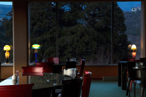 夕暮れ時の美術館内のティーラウンジでは淡いランプの灯りのむこうに芦ノ湖と富士山が浮かびあがり幻想的な時をお過ごしいただけます。(期間を限定して点灯)