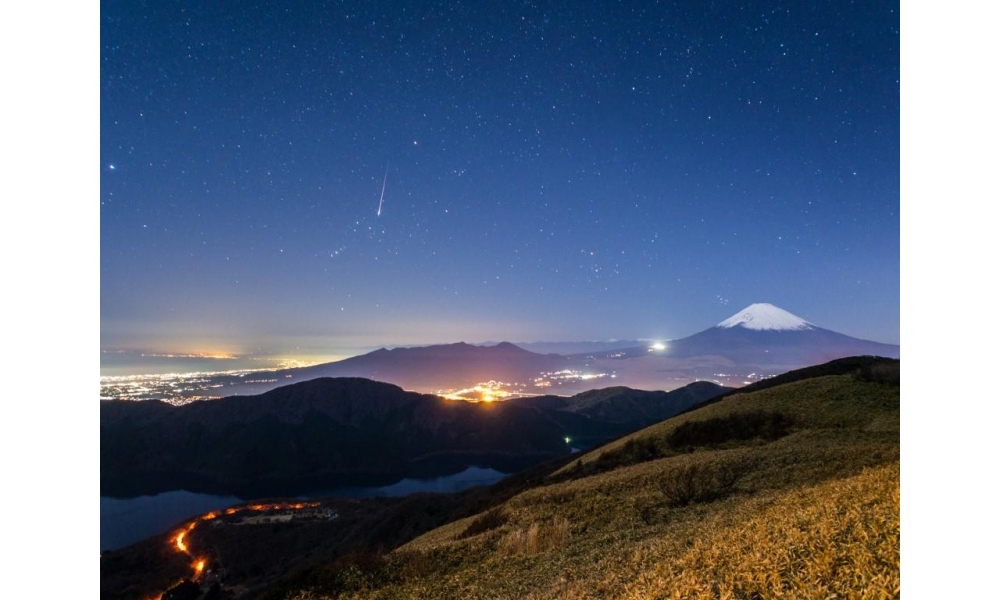 芦ノ湖に浮かびあがる遊覧船ライトアップと富士山