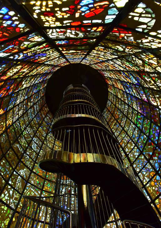 高さ18mのステンドグラスの塔、ガブリエル・ロアール《幸せをよぶシンフォニー彫刻》480枚のステンドグラスのパネルで