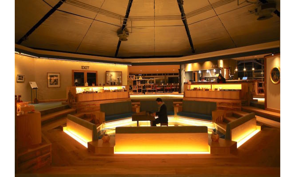 夕暮れ時の美術館内のティーラウンジでは淡いランプの灯りのむこうに芦ノ湖と富士山が浮かびあがり幻想的な時をお過ごしいただけます。(期間を限定して点灯)