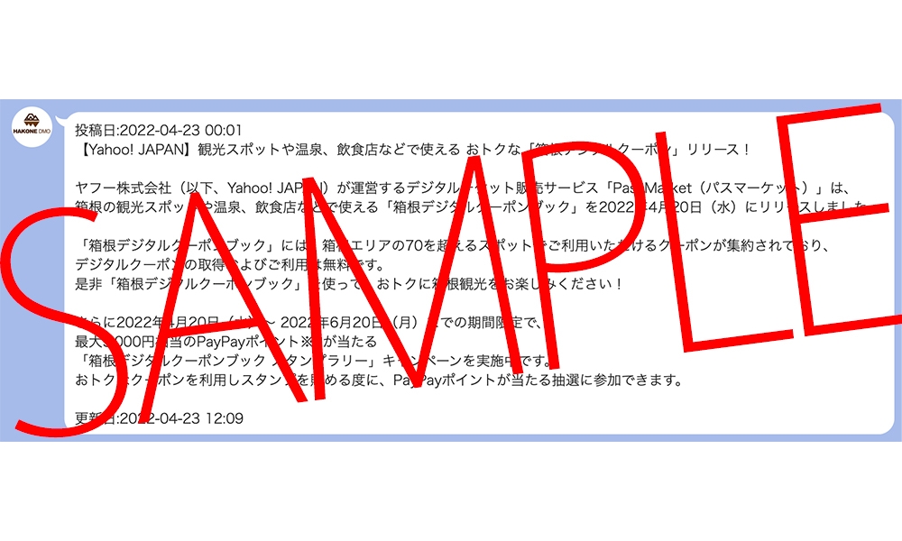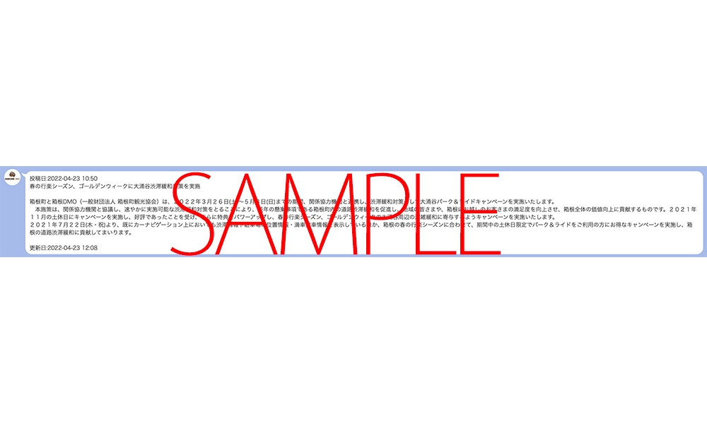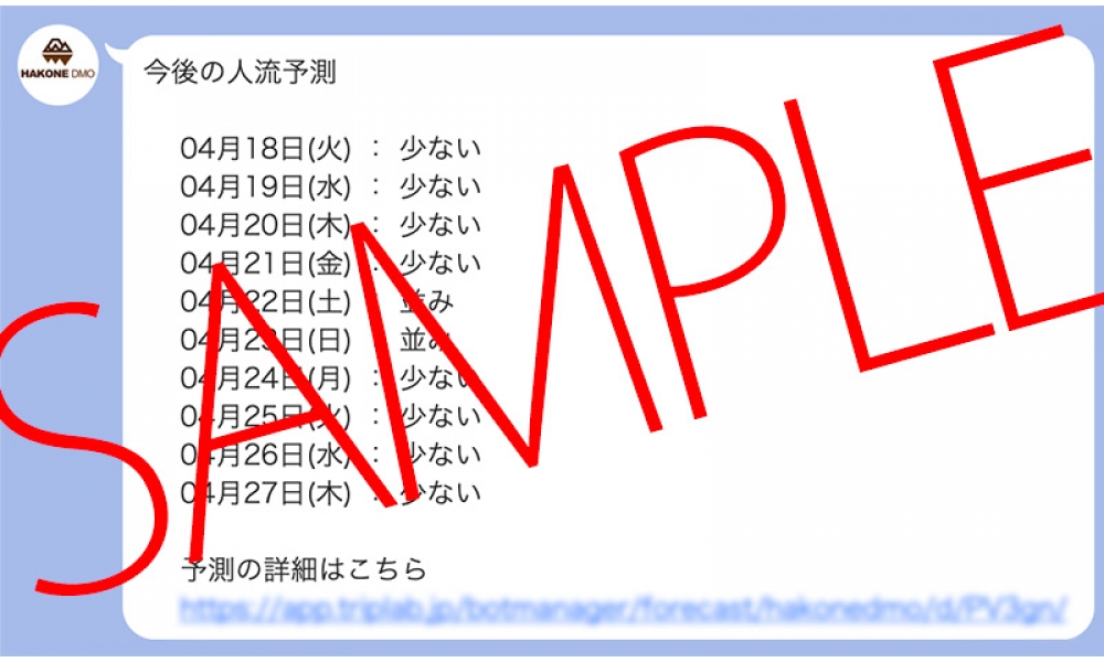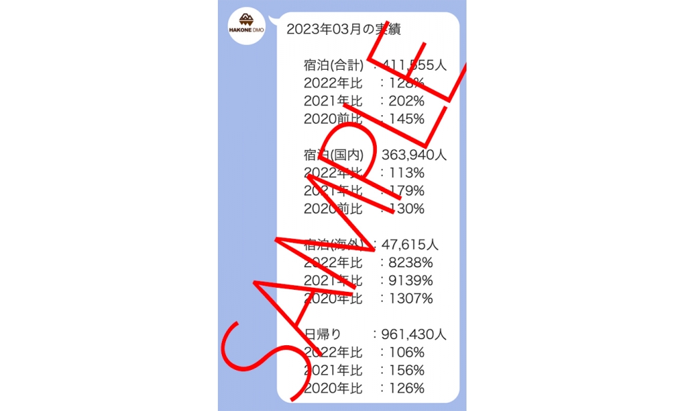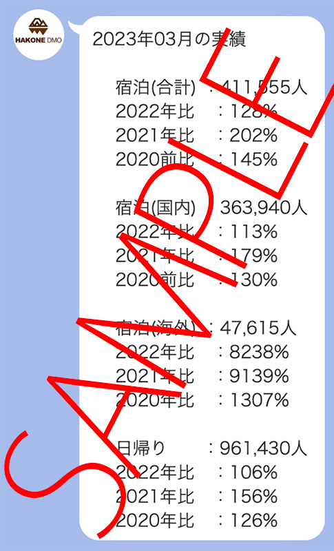 そこで、より幅広い箱根観光事業者様や住民の方を対象とし、各々の事業にご活用いただけるマーケティングデータをご提供し、データの価値を最大化していただけるよう、積極的かつ活用しやすい「LINE」を用いて、箱根町全体の状況を把握し事業に活かしていただける情報をご提供してまいります。