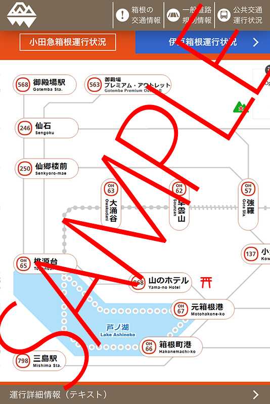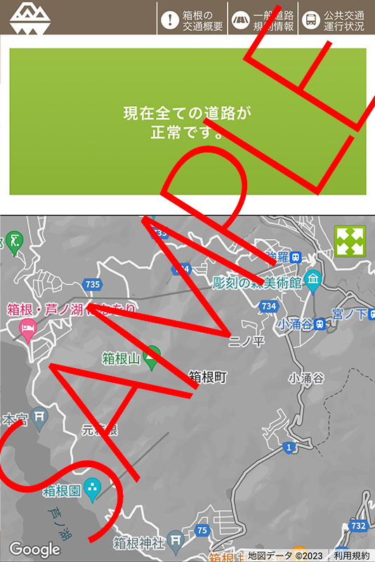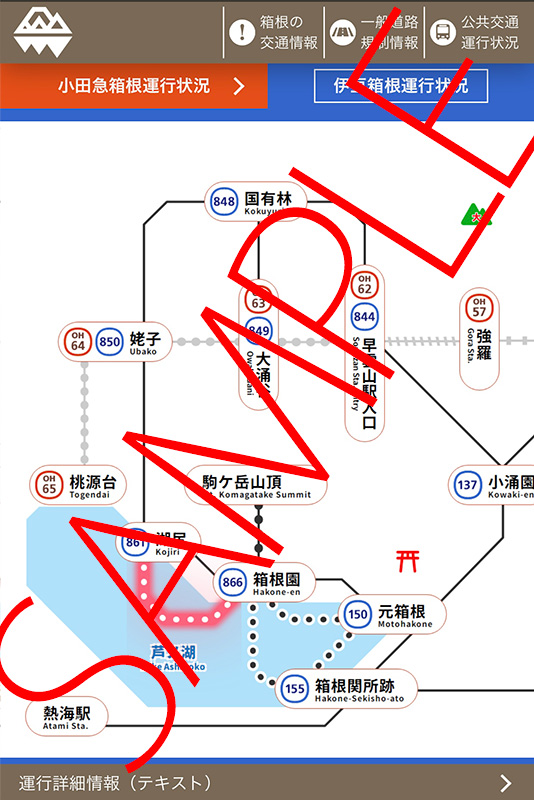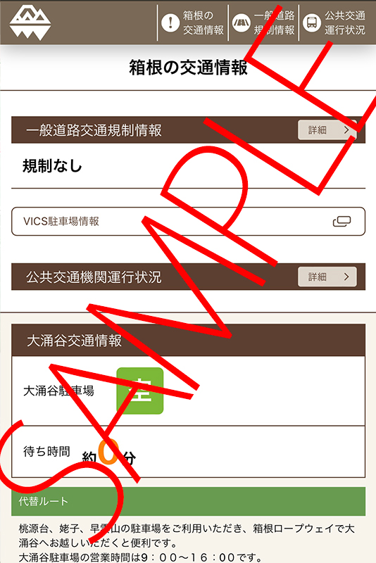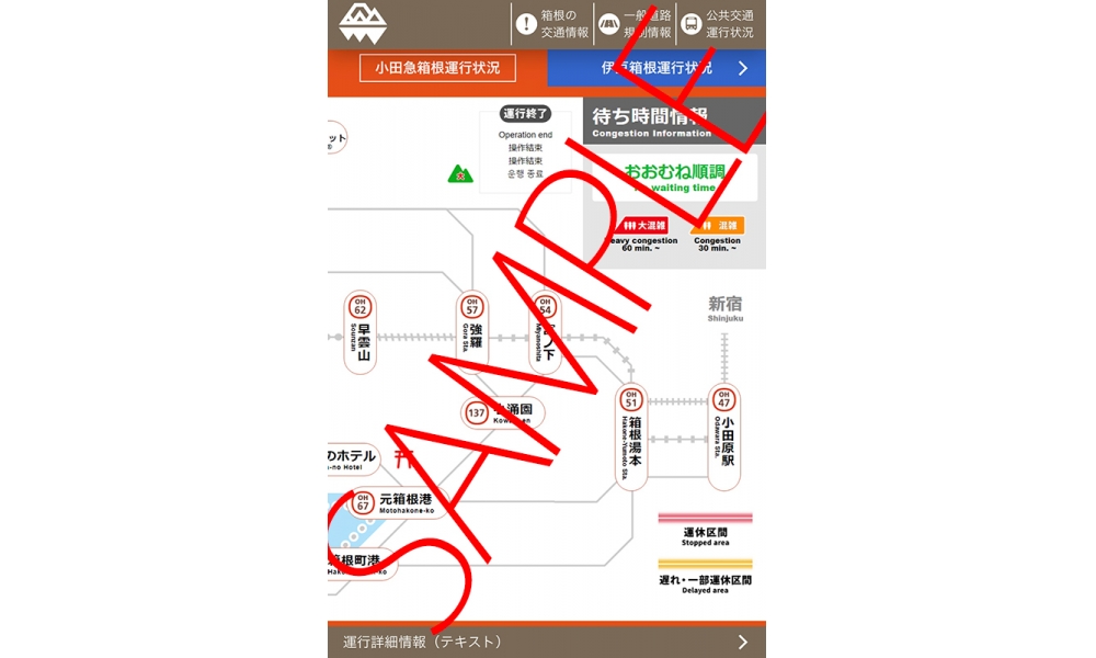 箱根全山で掲載している交通情報(箱根の交通情 報、一般道路規制情報、電車・路線バス運行状 況)に加え、新たに「混雑状況マップ」を追加した情報 をご覧いただくことができます。