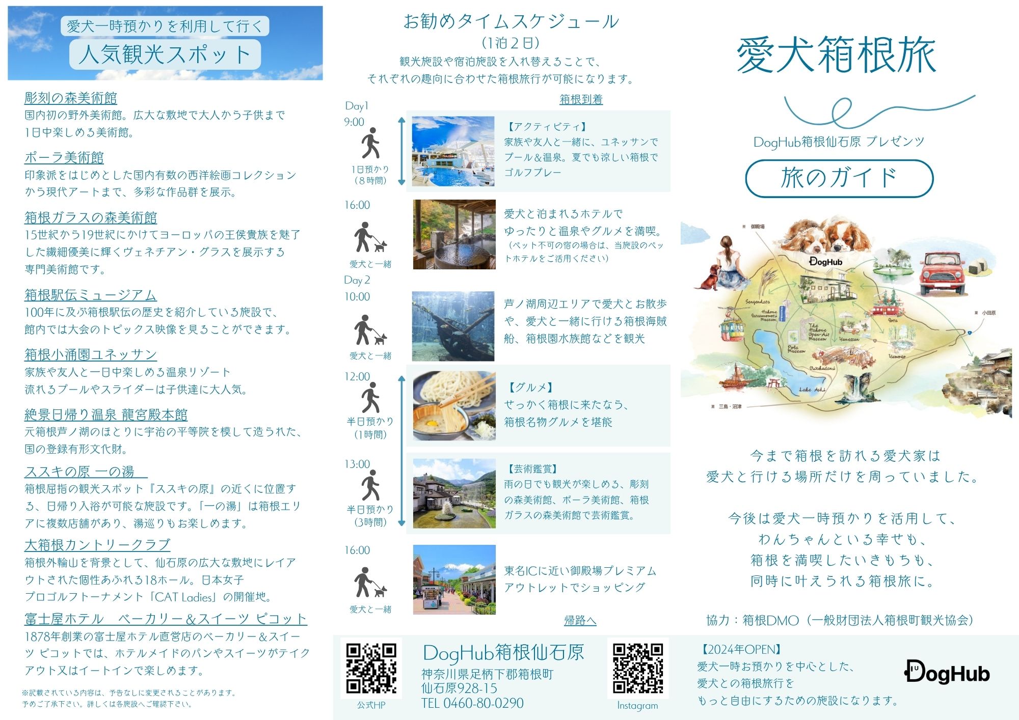 2024年7月にオープンした犬専用ペットホテル「DogHub箱根仙石原」は、夏の箱根観光シーズンに向けて愛犬家向けの旅行ガイドリーフレットを完成させ、箱根町内の観光施設や宿泊施設で配布を開始しました。