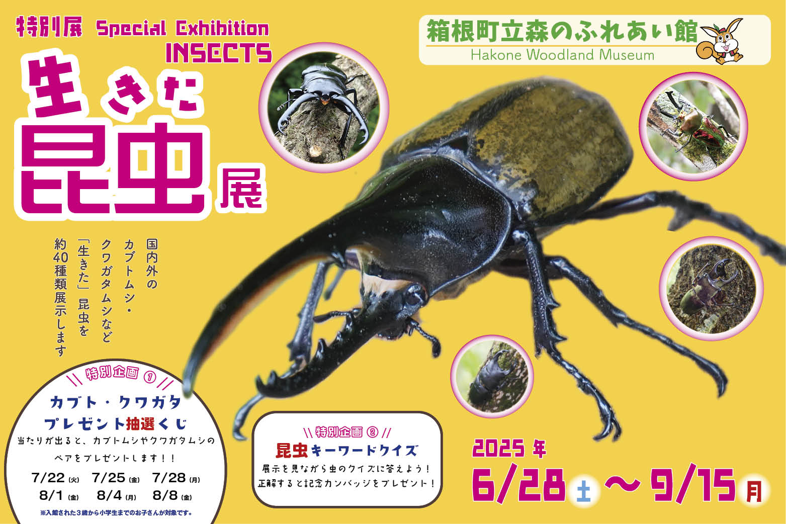 国内外に生息するカブトムシやクワガタムシをはじめ、チョウの幼虫や蛹、バッタ類、水生昆虫やトンボのヤゴなどさまざま昆虫を飼育展示します 。また、クヌギ林に見立てた大型ケージ(8月31日までを予定)を設置し、いきいきとしたカブトムシやクワガタムシをじっくりと観察できます。