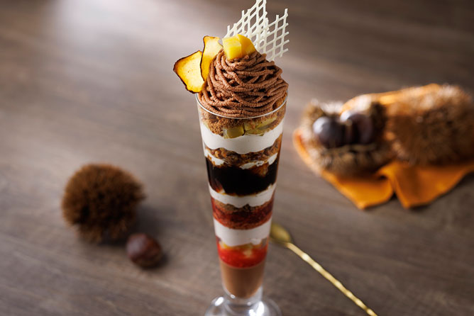 モンブランクリームにさつまいもと栗のシロップ漬け、チョコムースの甘味に程よい苦みのコーヒーゼリー。