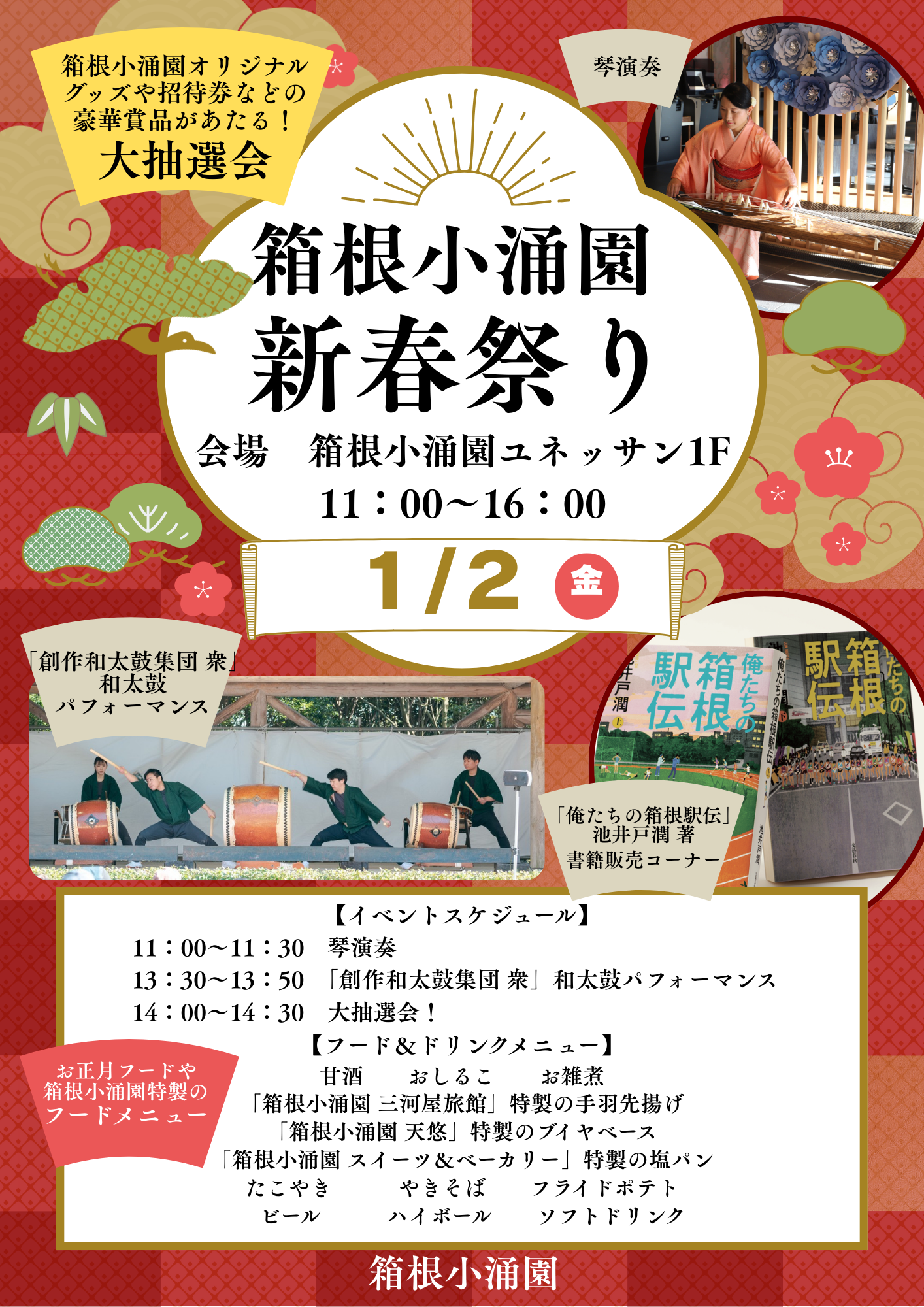 太鼓やお琴のパフォーマンスや、箱根小涌園自慢の特製フード販売、温かいお飲み物販売、豪華賞品があたる抽選会も開催いたします!