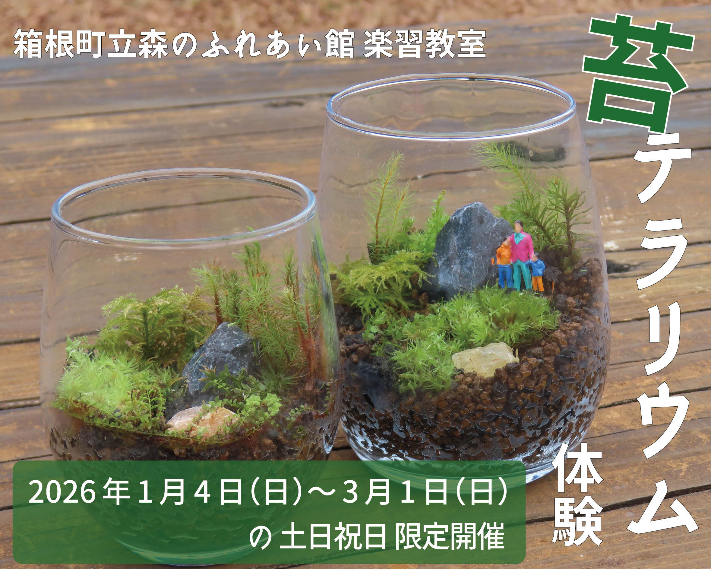 森のふれあい館の周りに広がる箱根やすらぎの森で、モリノコドウハコネの専門ガイドとの観察会を行ったあと、当館にて苔テラリウム体験を行うツアー(1月4日~2月21日)を開催します。申込方法・参加費等については下記のURLのページからご確認の上、モリノコドウハコネにメール(morinokodo@gmail.com)にて直接お問い合わせください。