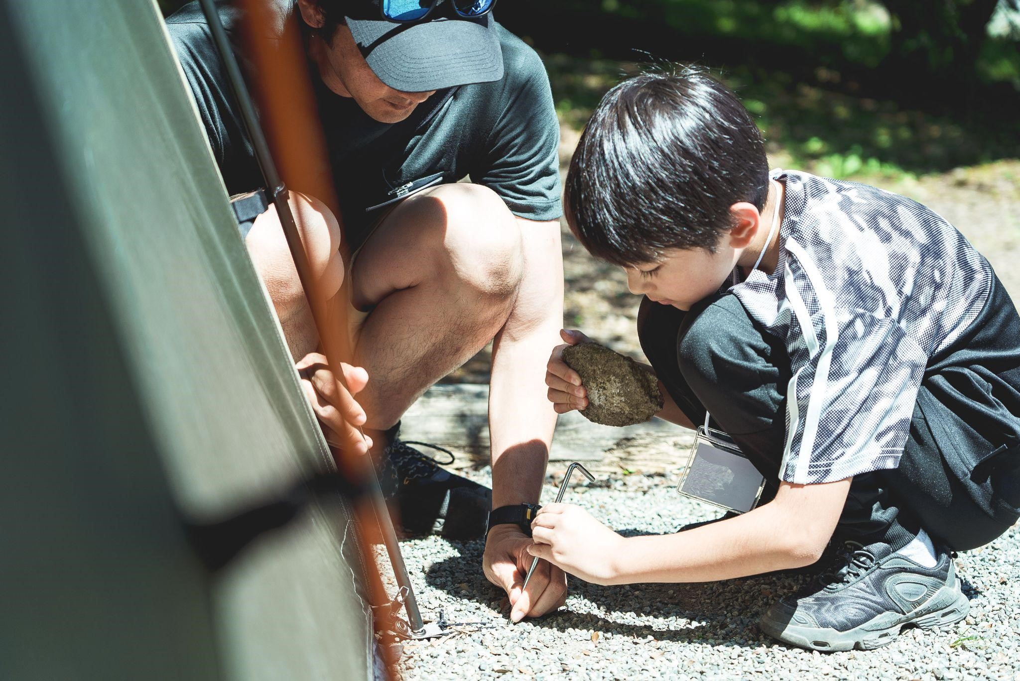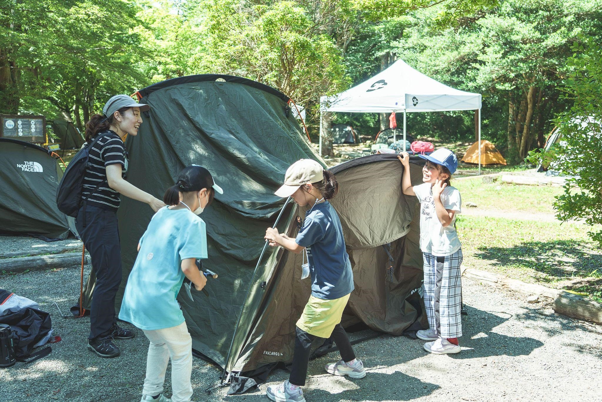 子どもたちを3人ほどのグループに分けひとつのテントを配ったら、スタッフは説明のために一度テントを設営し、あとは注意深く見守っている。すると「テントを張る」という課題を前に、30分前に出会ったばかりとは思えないほど子どもたちは親密になり、相談したり笑ったりしながらテントを張ってゆく。