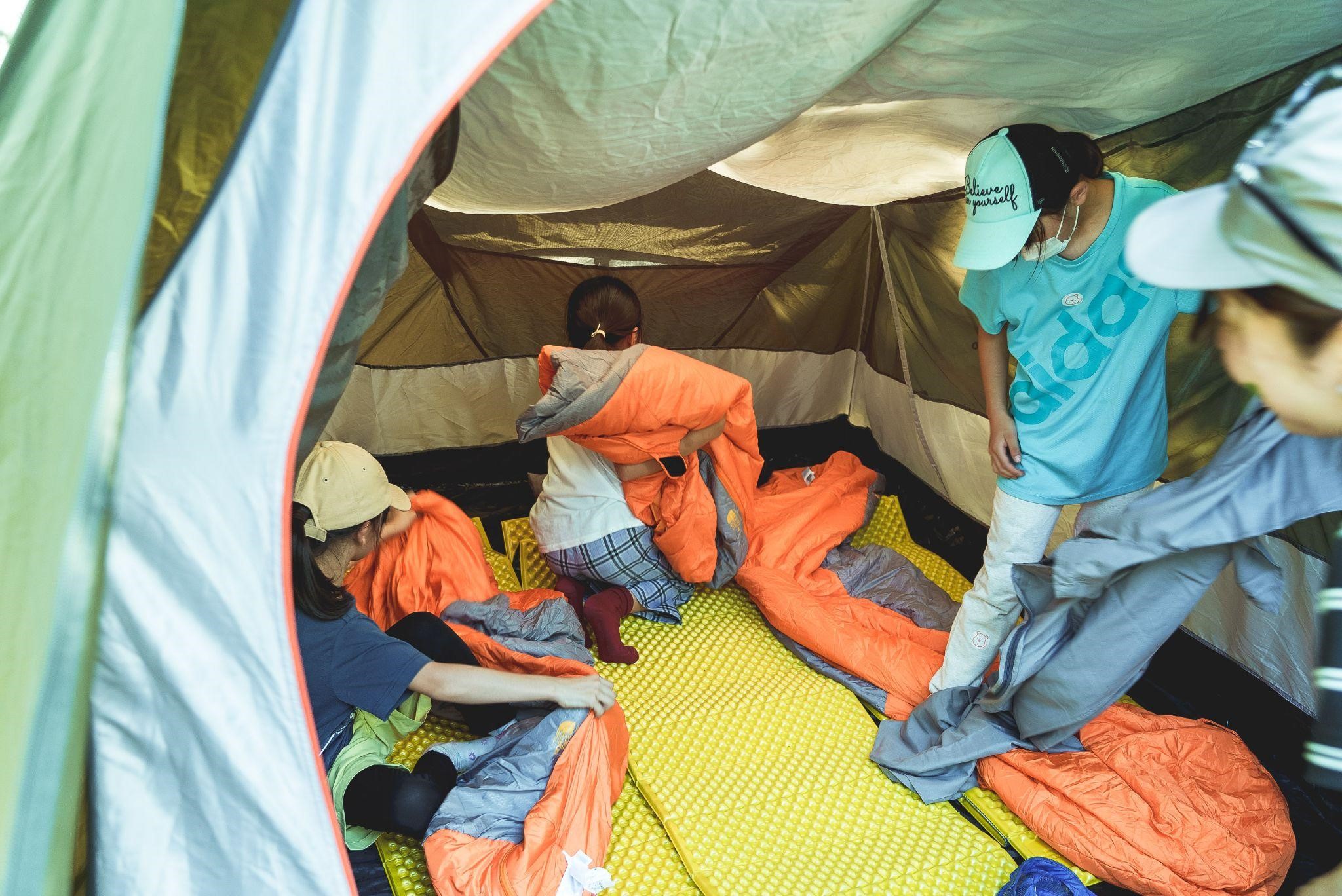 3〜4人でグループとなり、協力してテントを設営し、マットを敷いてシュラフを広げ、寝床を用意してゆく。そうした作業を通して、こちらが驚くほど打ち解けてゆく子どもたち