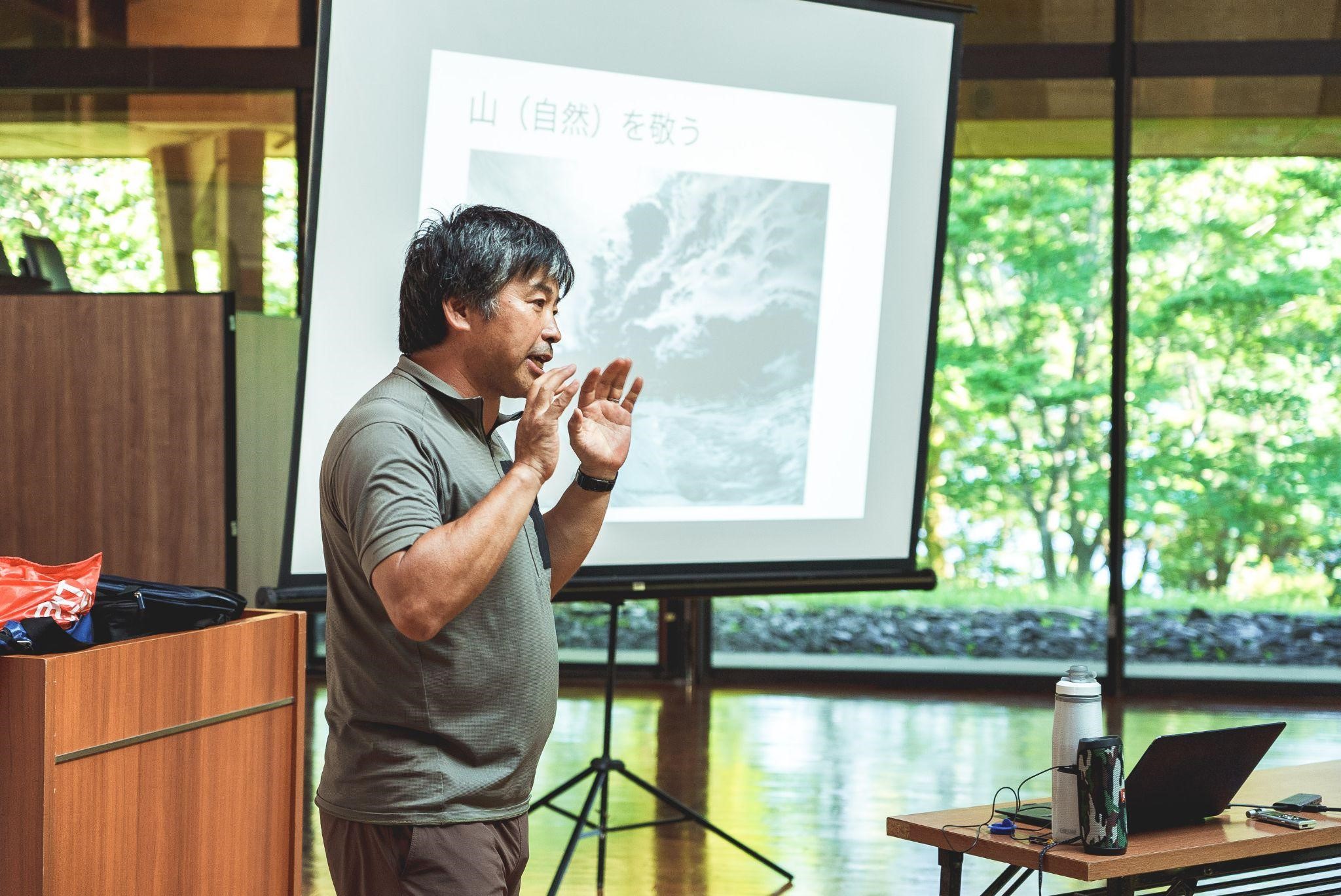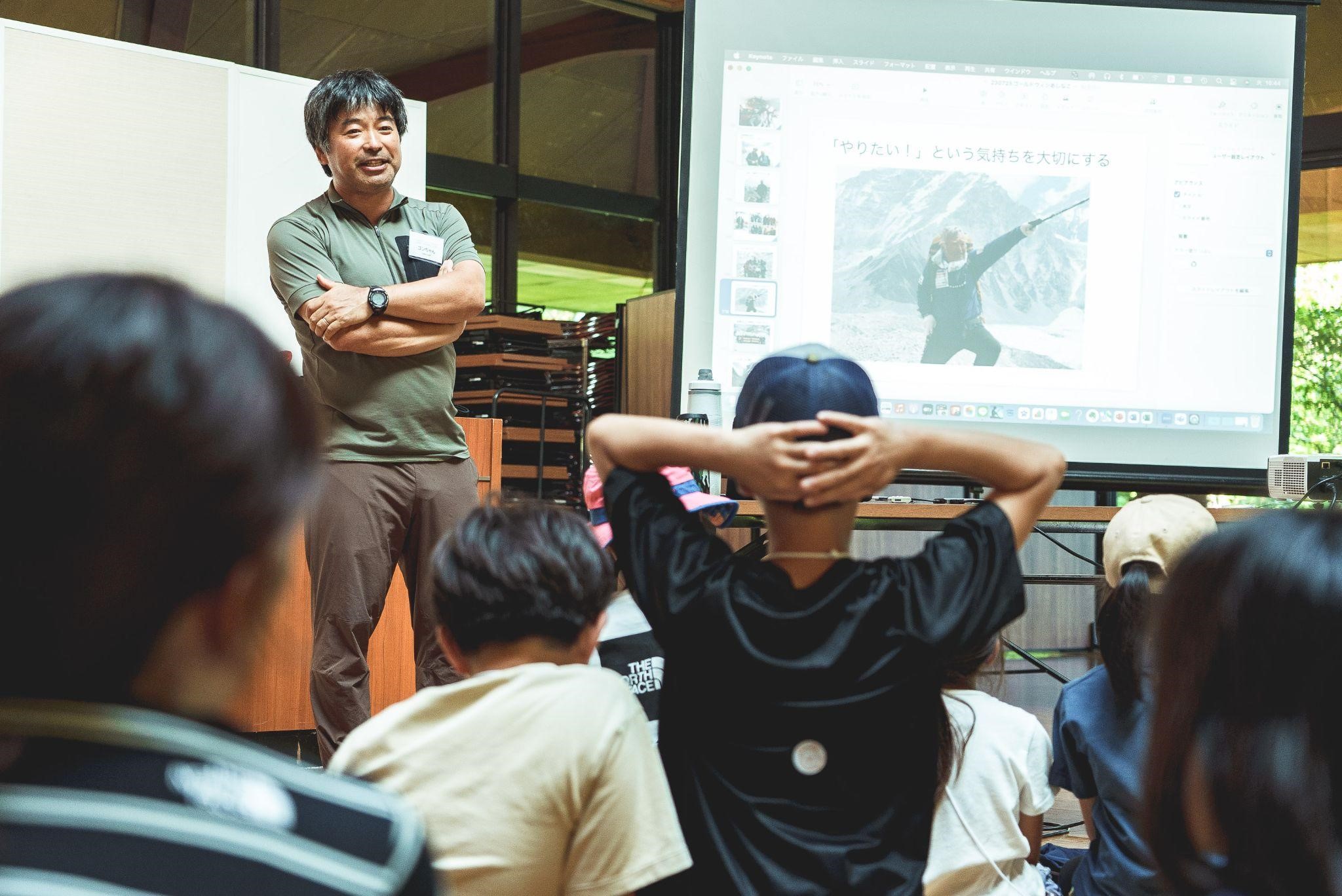 ビジターセンターから戻ると、三浦豪太さんによる冒険講座がはじまった。父・雄一郎さんとのエベレスト登山をスライドショーで見せながら、世界最高峰に挑む冒険の知られざる姿を伝えてくれる。