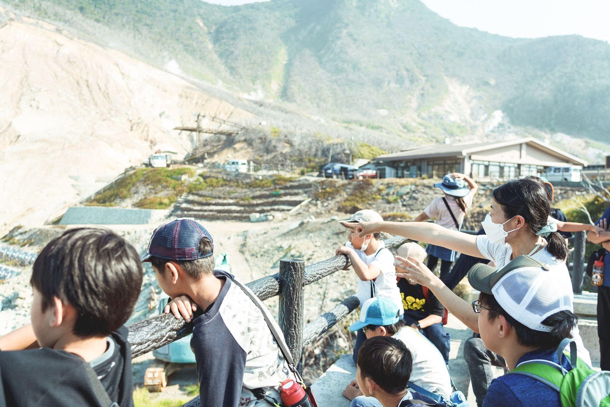 ロープウェイが大涌谷の駅に近づくと、地球が生まれた頃のような景色が迫り、生物感のない山肌からは煙がもくもくと湧きだしている。前夜、星の世界を案内してくれた山口さんが、この日は箱根の特殊な地形、独自の風土を生み出した火山の働きを、わかりやすく説明してくれる。全日、豪太さんが話してくれた大いなるなにかの気配が、ここには濃密に漂っている。