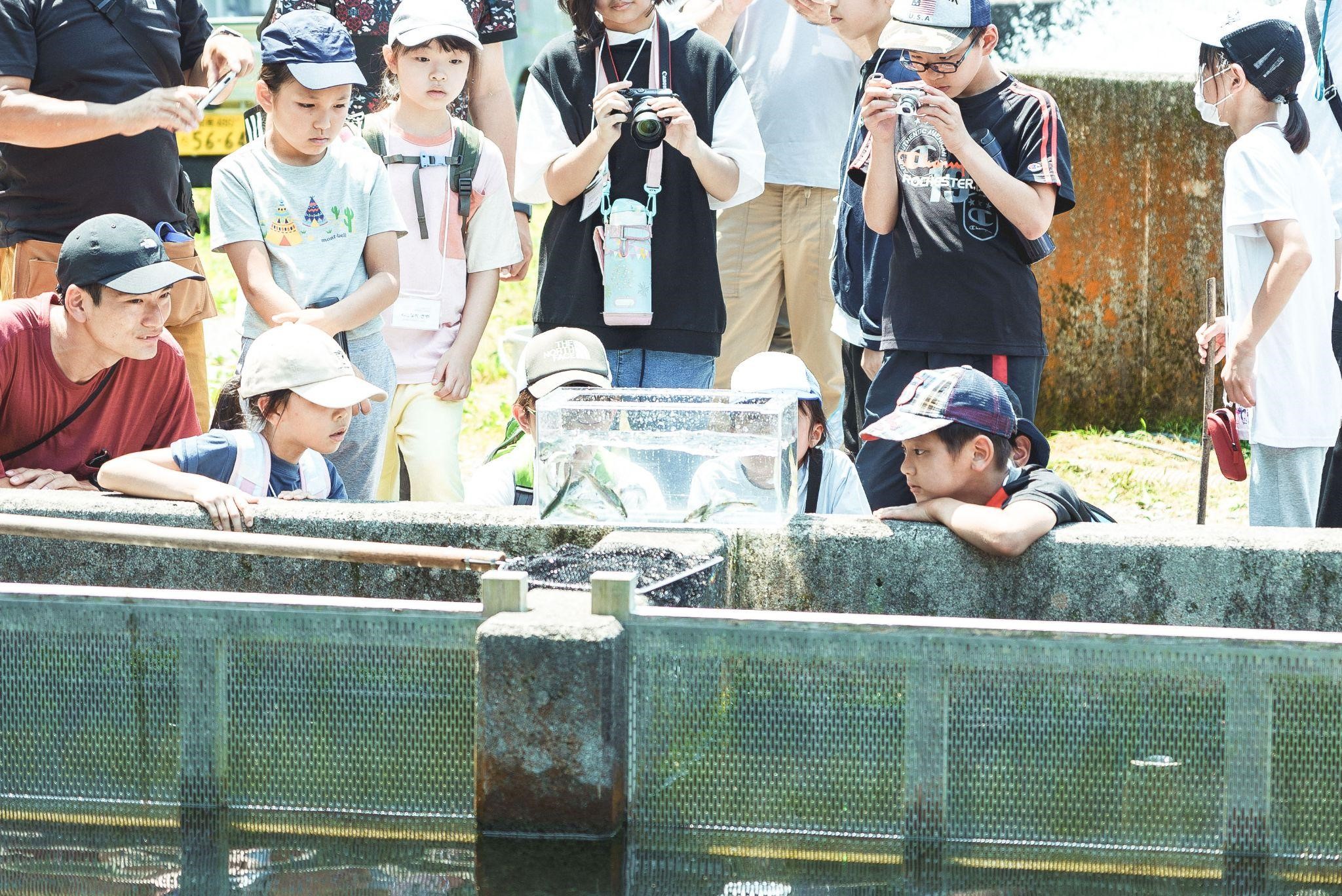 漁協の結城陽介さんが子どもたちに声をかける。おもしろいのは、魚種によって性格が異なること。子どもたちが近寄ると逃げてしまうサクラマス(ヤマメ)は、いつも餌をあげている結城さんの姿を追うように移動する。