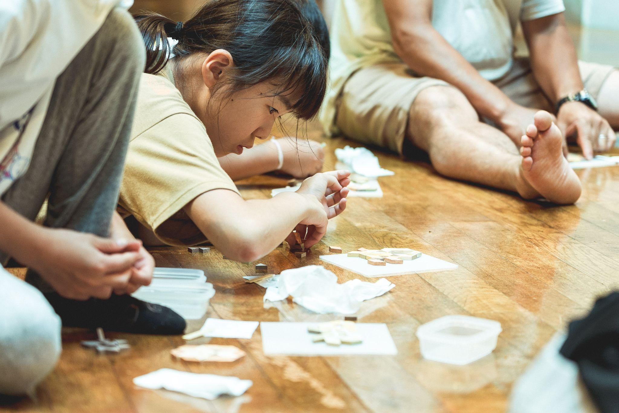 最後のプログラムである、箱根伝統の寄木細工教室。色とりどりの素材を合わせて試行錯誤。家族のお土産をつくる子も
