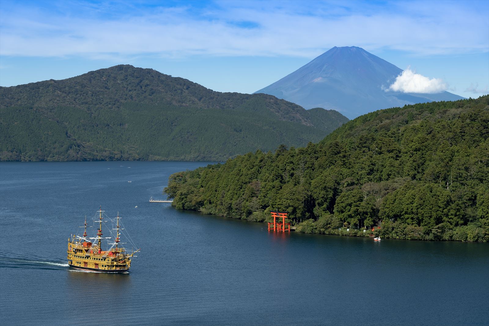箱根海賊船は、芦ノ湖を航行する観光船で、名前の通り海賊船を模したユニークなデザインの船です。桃源台港、箱根町港、元箱根港を結び、湖上を約25 ~ 40 分かけて進むクルーズです。船上では、風や波、そして周囲の自然を存分に感じることができます。