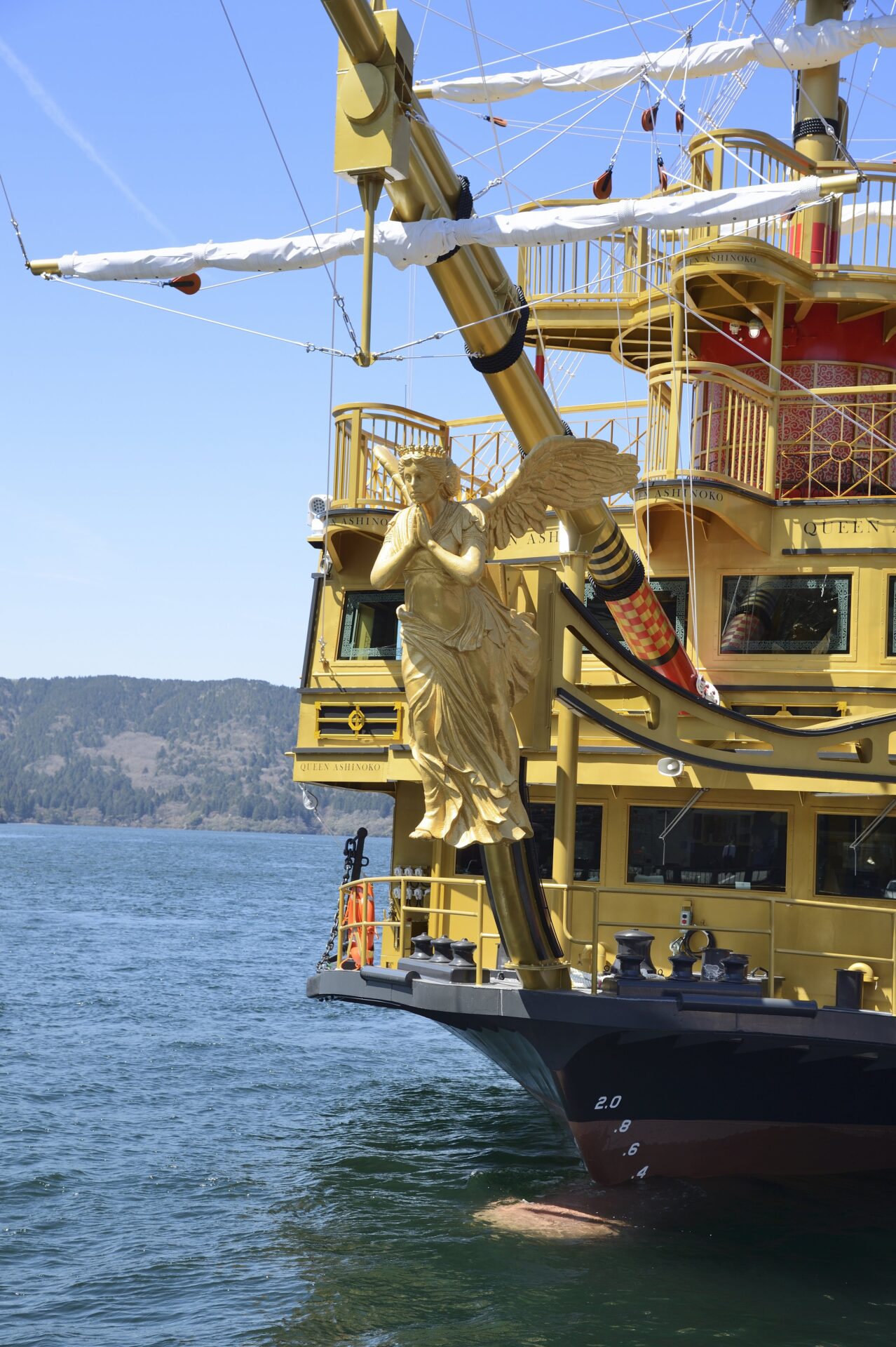 乗船する前、船の近くに立つと、海賊船らしい大きな船体を感じます。触れると金属でできた頑丈な船の外壁や装飾が特徴的です。港では水の音や風の音が聞こえ、湖のそばにいることを実感できます。