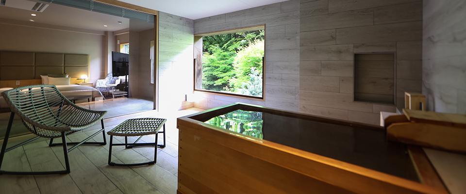全ての客室半露天風呂から、大自然の景色をお楽しみいただける構造になっており、中でも富士山や外輪山眺望の半露天風呂から眺める富士山や外輪山はとても美しく、森側からの眺望も、いつまでも眺めていたくなるほどです。