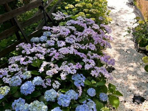 太陽の光が降り注ぐ新緑の中で咲き誇る紫陽花を、自然光の中でお楽しみいただけます。