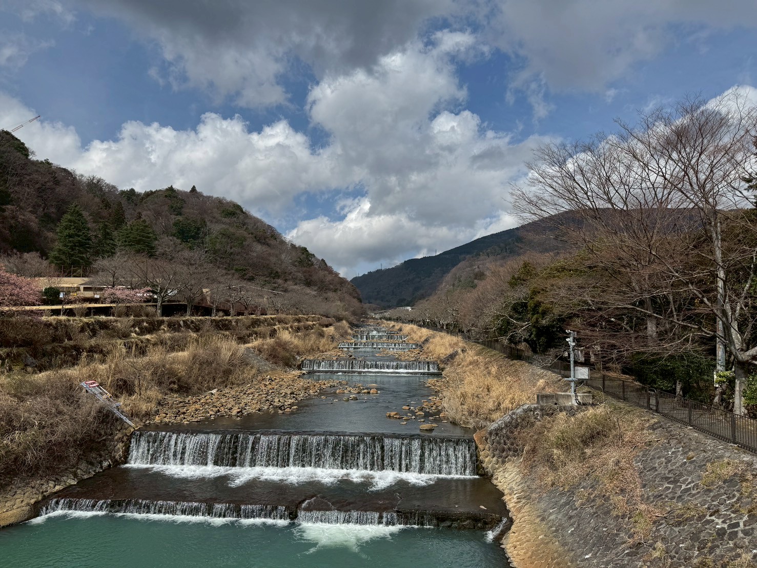 早川沿いに600mほどソメイヨシノの桜並木が続きます。また、近くの国道138号線沿いの仙石原までの間には40本ほどのシダレザクラの並木があり、それぞれの桜を楽しむことが出来ます。
