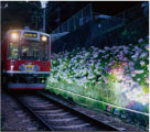 18時半を過ぎて辺りに夕闇が訪れると、箱根登山鉄道沿線はまた違う顔を覗かせ始めます。沿線6箇所のライトアップポイントで、光に彩られたあじさいを観賞することができます。闇夜に浮かぶあじさいの姿は、昼間のあじさいとはまたまるで違う花であるかのように感じられ、幻想的な雰囲気を帯び、車窓に浮かび上がります。