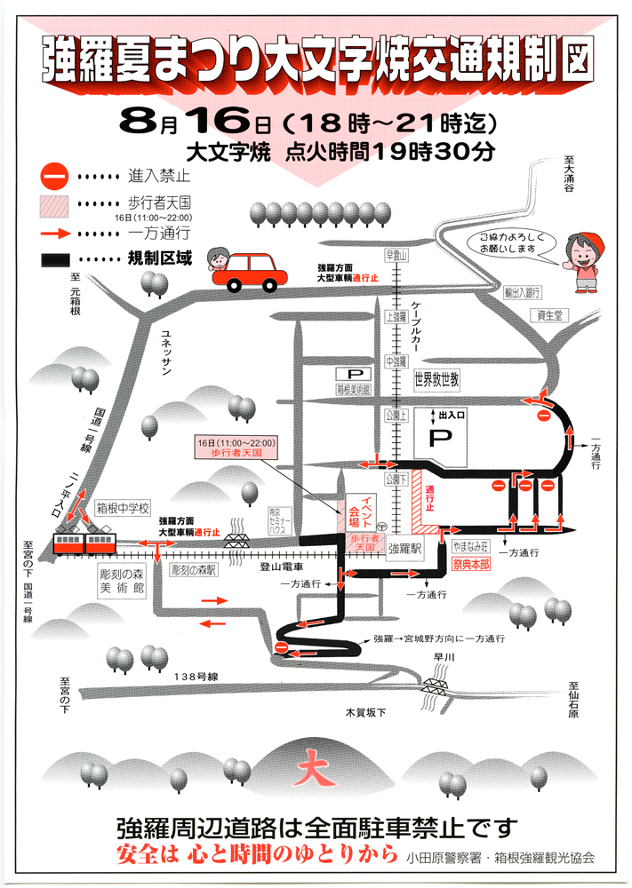 大文字焼は有縁無縁の霊を慰めるうら盆の送り火です。 二ヶ月も前より炎天下の山腹に於いて、刈取り、乾燥の作業が繰り返されます。乾燥した篠竹(箱根女竹長さ 3m 程) を直径 30cm程の束として 250 束作ります「。大」の字が大きく描かれる様、「大」の輪郭に沿って二重にし、約 1.5 m間隔に立てます。一筋の花火を合図に点火され、点が線となり文字となって皆様の眼前に「大」の字が浮かんでま いります。(「大」の字の「一」は長さが 108m、文字の太さは 7.5m にもなります。) 最後に、来る年、来る年、より大きく!美しく!という願いを胸に、お互い励まし合いながら汗を流し、黙々と準備を重ね、 当日は暗黒の急斜面に身を躍らせて、灼熱の熱風を浴びながら「大」の字を作る 80 余名の宮城野青年会の努力が あることを申し添えます。