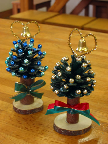 ツリーみたいなマツボックリにビーズやリボンを飾って、