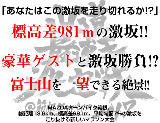 舞台は、MAZDAターンパイク箱根、総距離13.6km、標高差981m、平均勾配7%の激坂を走り抜ける新しいマラソン大会です。普段は走ることができない自動車専用道路を通行止めにすることで、ランナー専用道路に様変わり。誰にも邪魔されず絶景のフィニッシュに向けて走り抜けてください!!