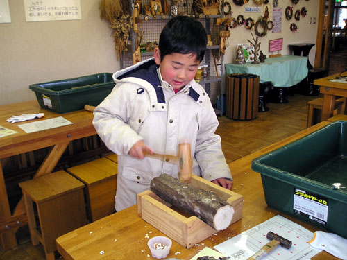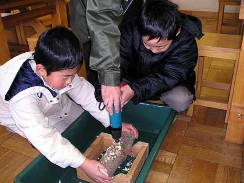 館内で電動ドリル・木づち・シイタケ菌(駒)を使って、植菌しホダ木を作ります。