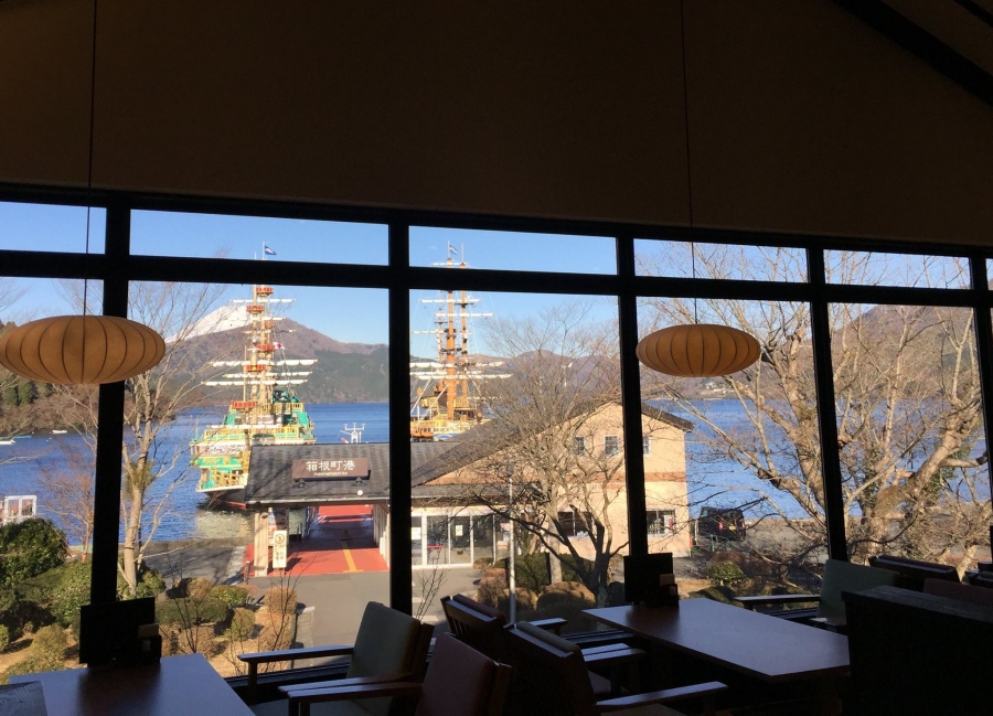 ちなみに、2階のcafe KOMONは湖側に大きな窓が配置されていて、天気が良いときれいな富士山や海賊船を見ながら食事やお茶を楽しめます。箱根周遊の途中にお立ち寄りください。