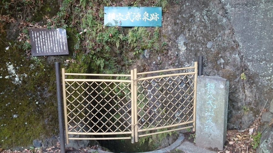 駐車場と玄関を入った横には、当時使われていた『横穴式源泉』の跡がありロビーの壁は、当時の岩肌がそのままありとても迫力があります。
