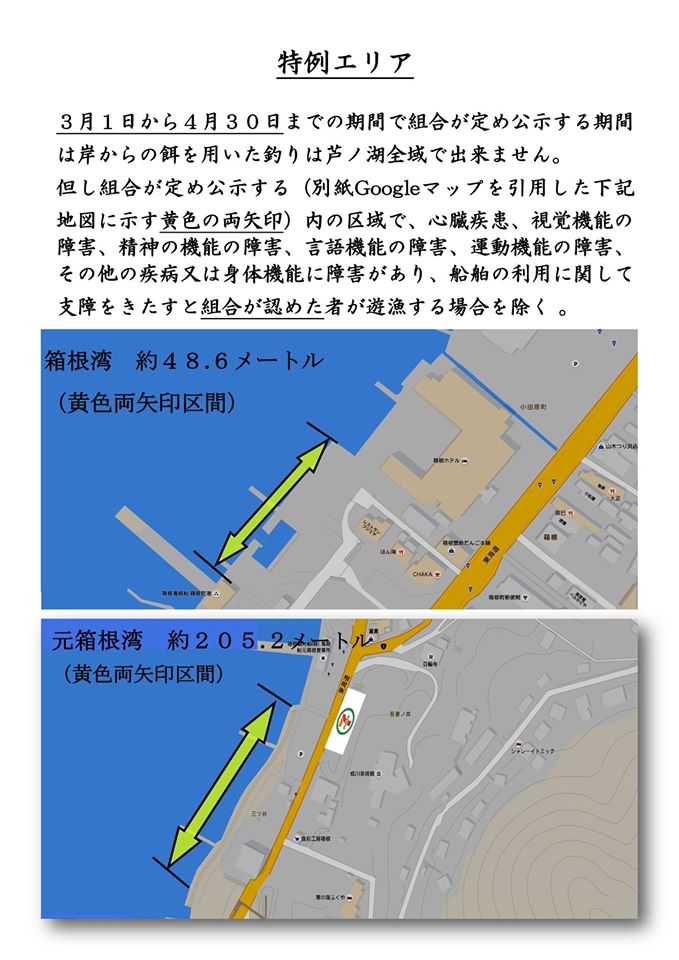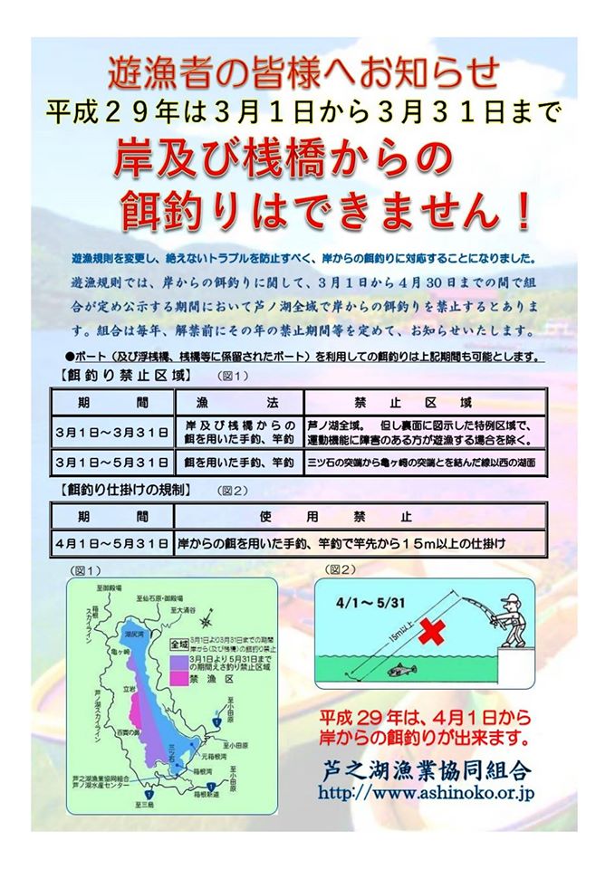 そんな芦ノ湖の釣りですが、3月31日(金)までは芦ノ湖全域で岸及び桟橋からの餌を用いた手釣・竿釣が禁止となっています。また、一部区域では5月31日(水)まで餌釣りが禁止となっていますので、ご注意の上釣りをお楽しみいただきたいと思います。