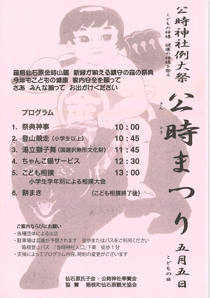 本日(5/5)ですが、箱根仙石原金時山麓の公時神社(金太郎のモデルになった坂田金時を祭る神社)例大祭である「公時まつり」があります。