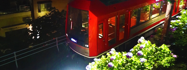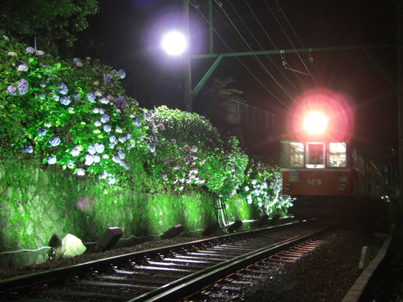 18時半を過ぎて辺りに夕闇が訪れると、箱根登山鉄道沿線はまた違う顔を覗かせ始めます。沿線6箇所のライトアップポイントで、光に彩られたあじさいを観賞することができます。闇夜に浮かぶあじさいの姿は、昼間のあじさいとはまたまるで違う花であるかのように感じられ、幻想的な雰囲気を帯び、車窓に浮かび上がります。