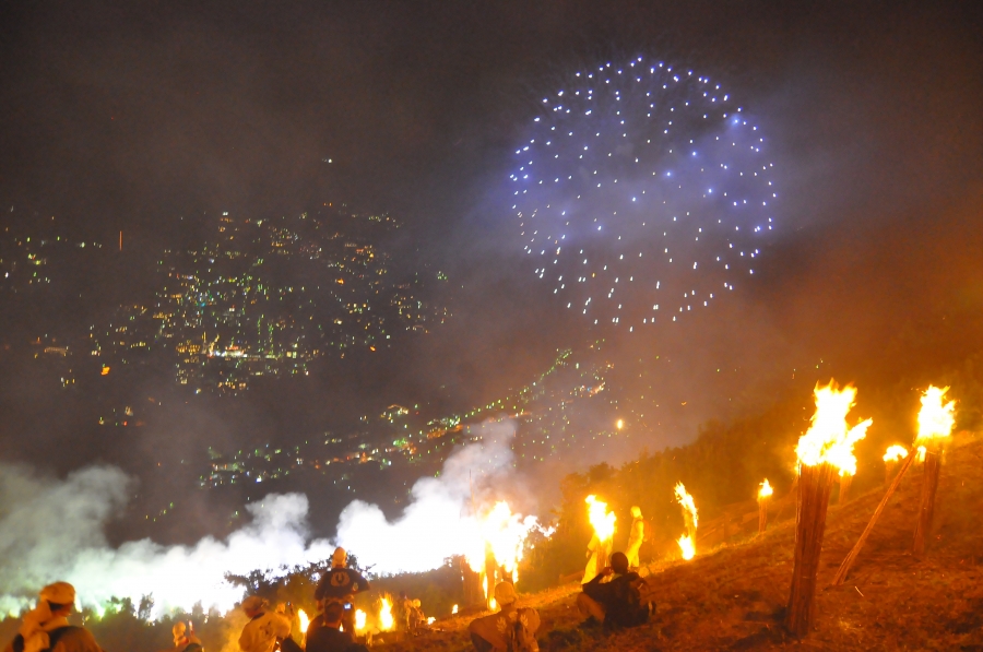 二ヶ月も前より炎天下の山腹に於いて、刈取り、乾燥の作業が繰り返されます。乾燥した篠竹(箱根女竹長さ3m程)を直径30cm程の束として 250 束作ります。「大」の字が大きく描かれる様、「大」の輪郭に沿って二重にし、約1.5m間隔に立てます。一筋の花火を合図に点火され、点が線となり文字となって皆様の眼前に「大」の字が浮かんでまいります。(「大」の字の「一」は長さが 108m、文字の太さは 7.5mにもなります。)