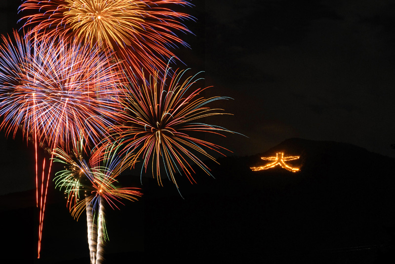 夕方から曇り予報が出ましたので、本日の大文字焼・花火・イベント実施いたします。