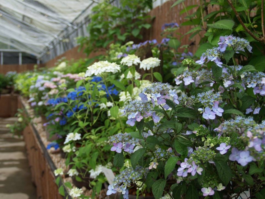 日本原種の可憐な姿が特徴の山あじさいや、色鮮やかで華やかな西洋あじさいたちが会場いっぱいに咲き誇っています。
