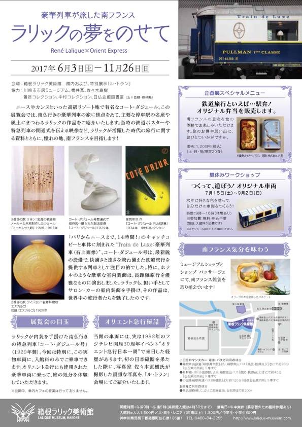 目玉はラリックが内装を手掛けた南仏行きの特別列車「コート・ダジュール号」(1929年製)。豪華列車のオリエント急行の乗車は通常は別料金ですが今回は入館料のみでご乗車、車内の作品のご鑑賞ができます。(車内でのデザートとドリンクのご提供は企画展の間はお休みさせて頂きます。)、企画展開催中の土・日・祝日には一日20食限定でオリジナル駅弁(1,200円)も販売!ミュージアムショップ「パッサージュ」には南仏の雑貨が揃っています!