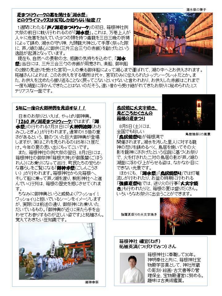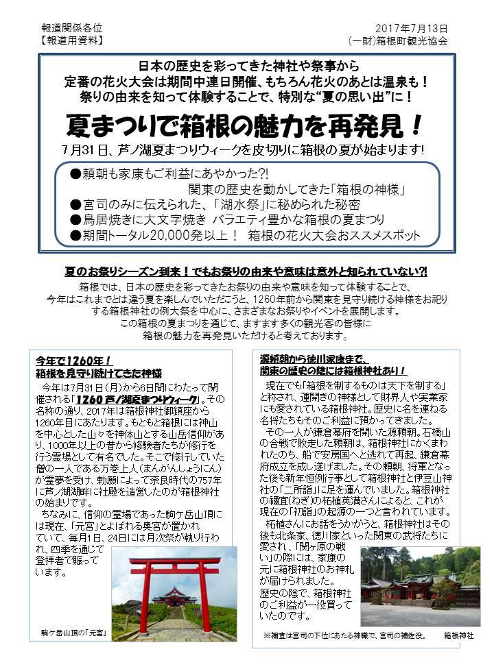 上記お祭り・花火大会の魅力につきましては、報道関係各所に配布した箱根の夏まつりをPRしたニュースレター(写真として掲載しています)などもご一読いただければ、夏の思い出としてさらに特別なものになると思います。7月31日~8月5日に箱根にお出かけをご予定されておりましたら、是非、「1260芦ノ湖夏まつりウィーク」へのご参加もご検討いただき、箱根の夏を満喫していただければと思います。