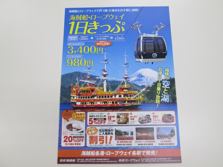 | お問合せ先 | (1)箱根観光船㈱営業推進部 ℡0460-83-6325(平日・休日9:00~17:00) http://www.hakone-kankosen.co.jp (2)箱根ロープウェイ㈱営業推進部 ℡0465-32-2205(平日9:00~17:00) http://www.hakoneropeway.co.jp |