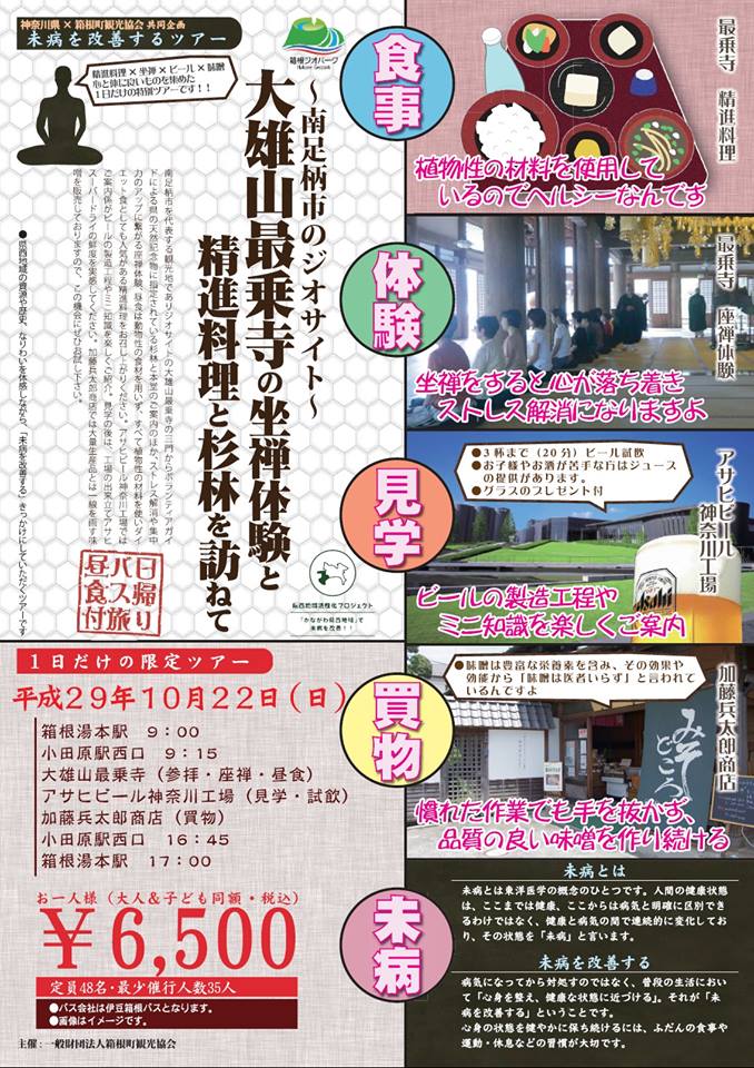 上記両ツアーともに神奈川県と箱根町の共同企画(県西地域活性化プロジェクトの一環)となっており、県西地域の資源や歴史、なりわいを体験しながら、「未病を改善する」きっかけにしていただくツアーです。10月に箱根へお出かけのご予定されておりましたら、ぜひ、今回ご紹介した上記ツアーなどで計画案の一つとしてご検討して、心身のリフレッシュなどにもお役に立てていただければと思います。