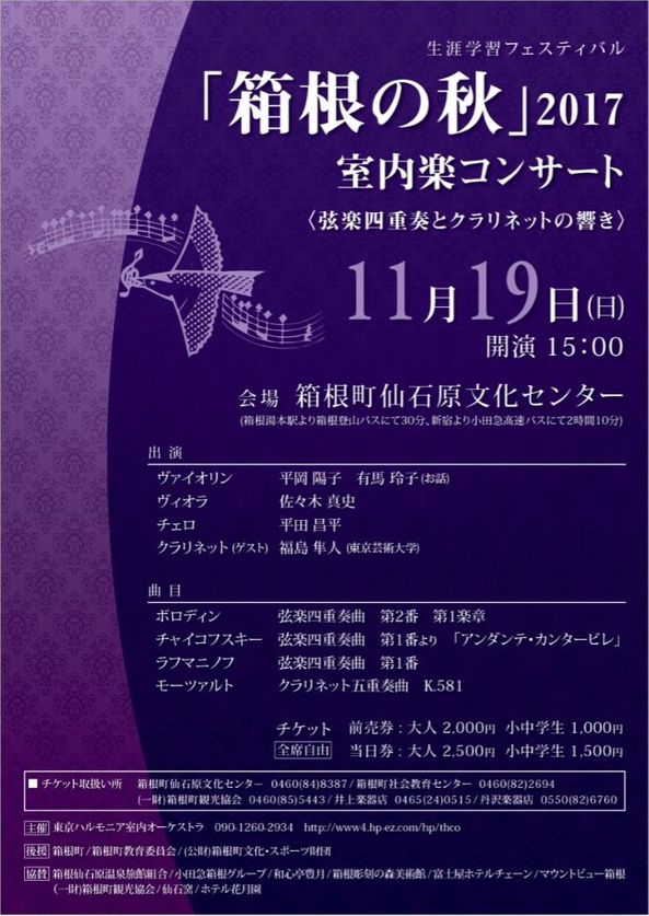 | 料金 | チケット:全席自由 前売券:大人2,000円 小中学生1,000円 当日券:大人2,500円 小中学生1,500円 チケット取り扱い所: 箱根町仙石原文化センター:0460-84-8387 箱根町社会教育センター:0460-82-2694 (一財)箱根町観光協会:0460-85-5443 |